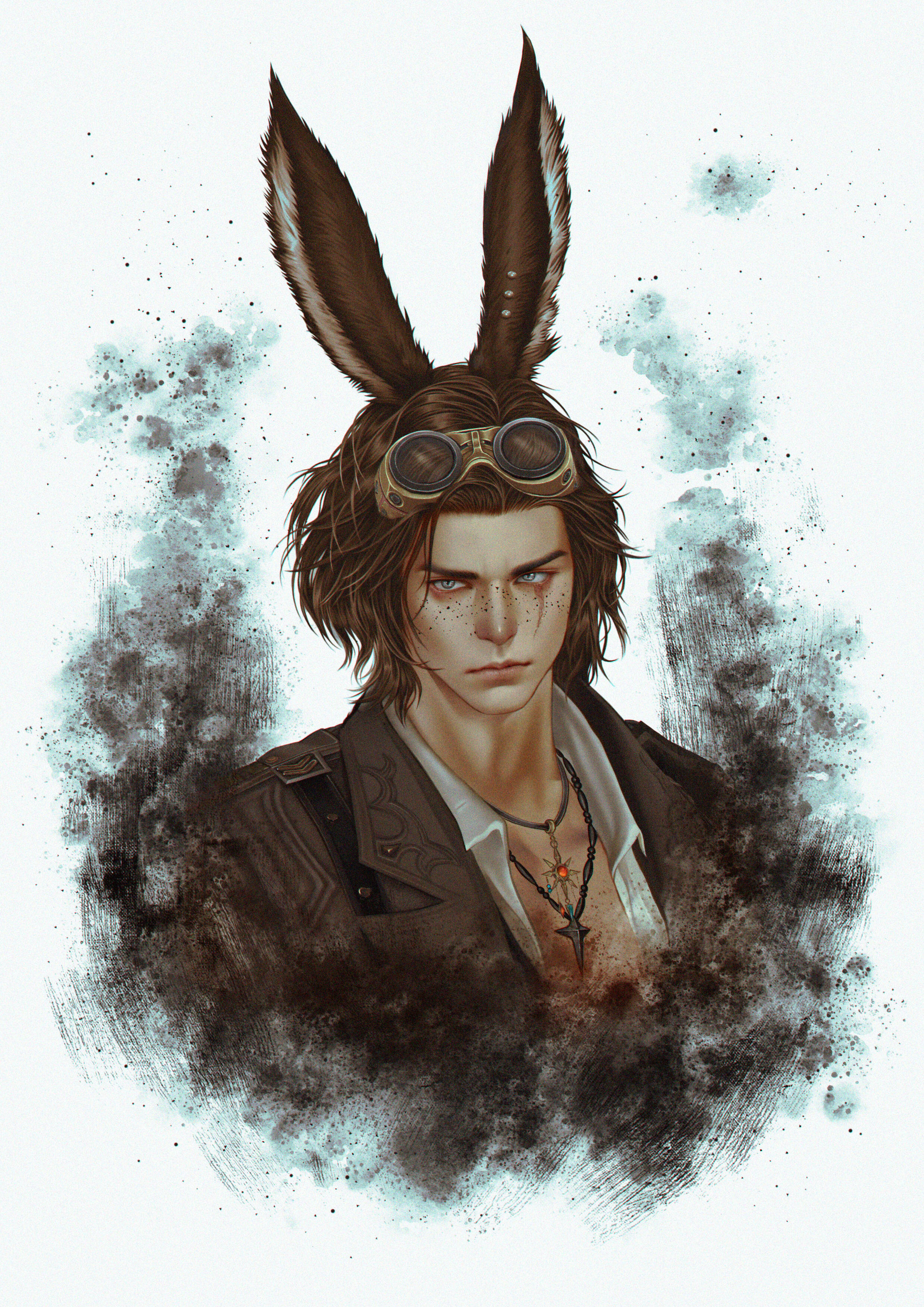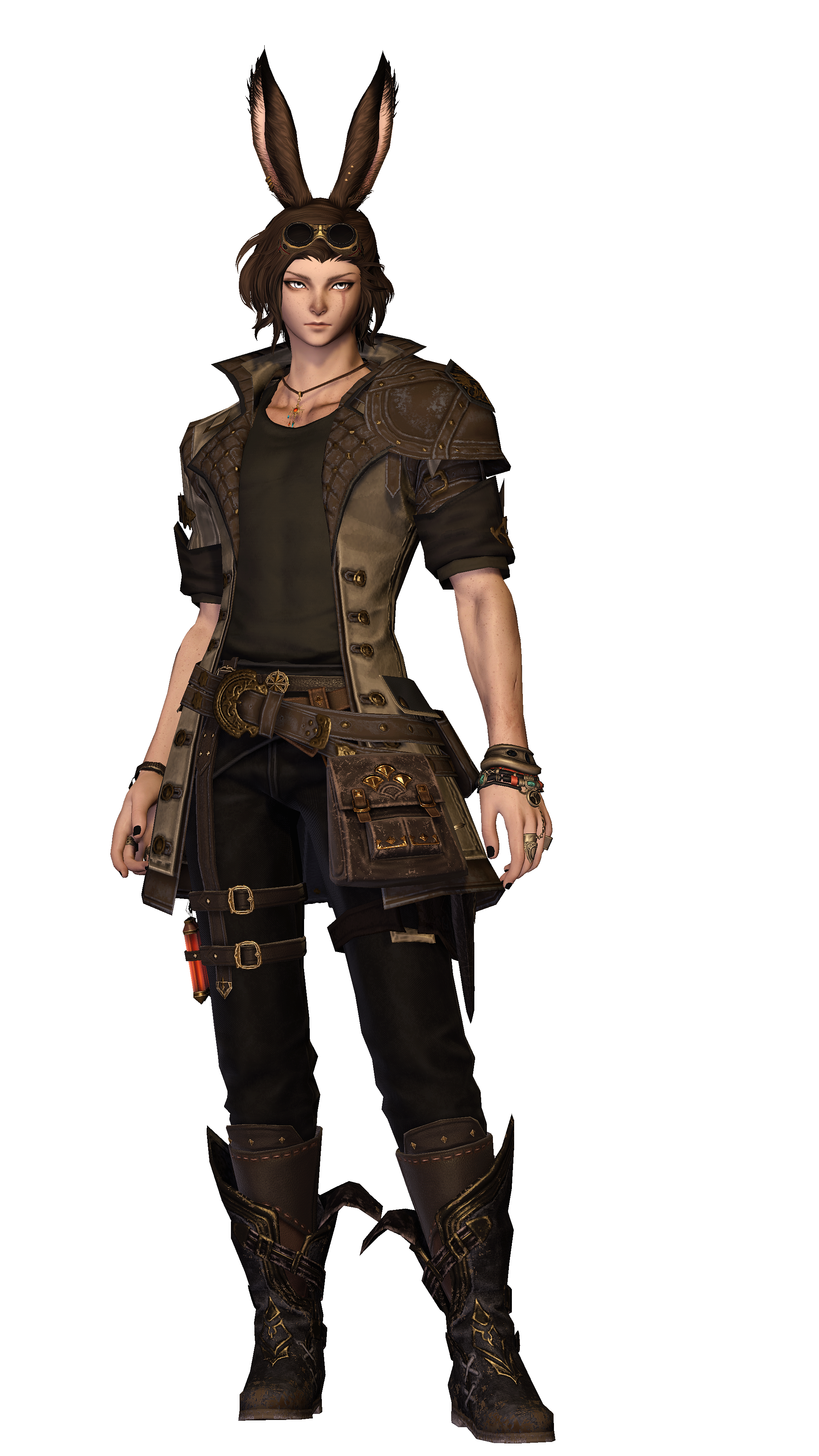 What one sees. Standing at six feet and one ilm with a slender and yet muscular build, most people would swear Loi'ven is taller than they actually are - undoubtedly thanks to their long, black-tipped ears. Wavy brown hair frames a face adorned with freckles and a dusty nose, accompanied by a light scowl most times. Their most striking features however are their eyes - white as freshly fallen snow as well as a long scar marring the left cheek.